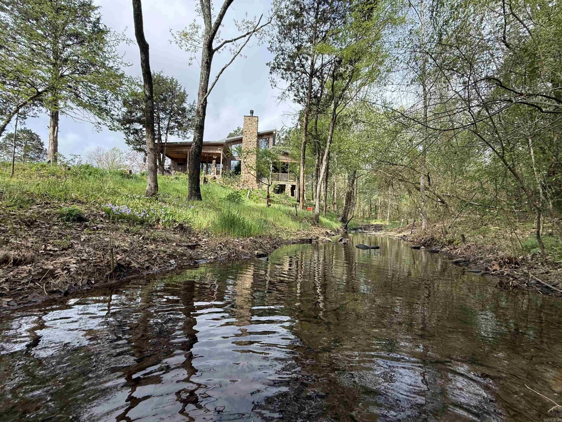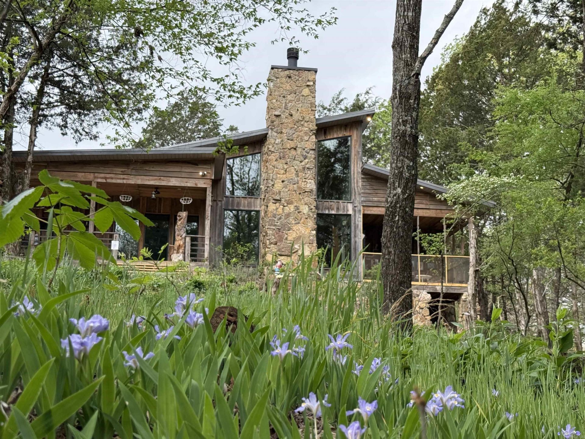 Absolutely stunning mid-century style lodge nestled in the middle of 5 private acres next to a gorgeous creek. You won't believe the peace and tranquility you'll find when you step into this home with 20' ceilings, open floor plan, natural light, gorgeous stone fireplace built with rock from White County, pine floors and beams all locally milled, all custom light fixtures from Poland and Slovenia, two living areas, custom kitchen cabinets and countertops with GE cafe appliances, and a loft for an office/playroom or music room. The primary suite features a custom tiled shower room, huge walk-in closet and a partially screened-in porch for sipping your coffee by the running water! The exterior is a mix of locally milled red and white oak. Other features include a spectacular mudroom, covered porches and don't forget the 30x40 shop with a separate wood-working room and steps leading upstairs to 1200 sq ft finished living space including a huge rec room with two bedrooms and a full bath all centrally heated & cooled. This stunning home was built with exceptional charm and intentional craftsmanship in every single room! Make your appointment to tour this breath-taking retreat today!